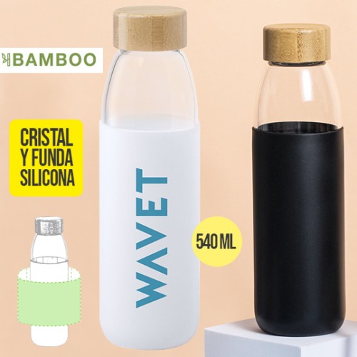 Bidón de línea nature de 540ml de capacidad. Fabricado con cuerpo de cristal y tapón a rosca de bambú. Incluye funda de silicona y viene presentado en caja individual de atractivo diseño.