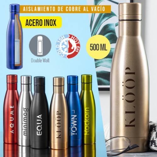 Bidón térmico de acero inox con doble capa de 500ml. Fabricado con doble capa y aislamiento de cobre al vacío, permitiendo mantener el calor y el frío durante un tiempo prolongado, llegando a las 12 y 48 horas respectivamente. Con tapón a rosca para un sellado perfecto. En acabado metalizado y disponible en amplia gama de colores. Presentado en atractiva caja de diseño. 500 ml. Aislamiento de Cobre al Vacío