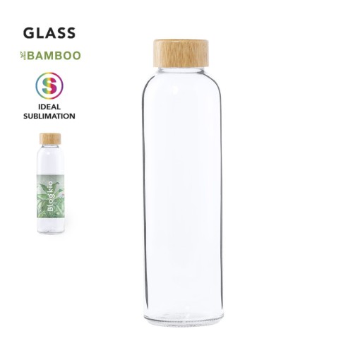 Bidón transparente de cristal de 500 ml de capacidad, con tapón a rosca en bambú y libre de BPA. Presentado en atractiva caja de diseño kraft. 500 ml. No apto para sublimación