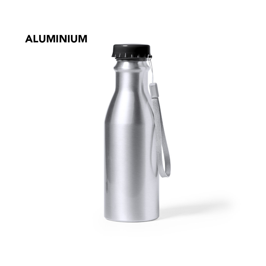 Bidón de 500 ml de capacidad, fabricado en aluminio de acabado brillo. Con original tapón chapineta en negro, a rosca y con cinta de transporte. Libre de BPA y presentado en caja individual de diseño kraft. 500 ml