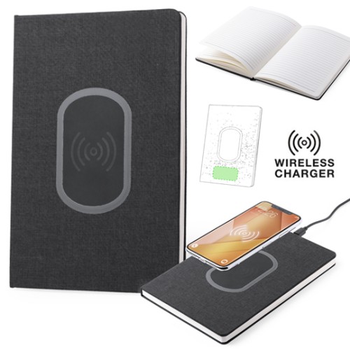 Bloc de notas cargador en resistente poliéster 300D con cargador inalámbrico integrado. De sobrio diseño y original estación de carga en la portada. Incluye 80 hojas con disposición a una raya. Inalámbrico 5W. Portada Rígida. 80 Hojas