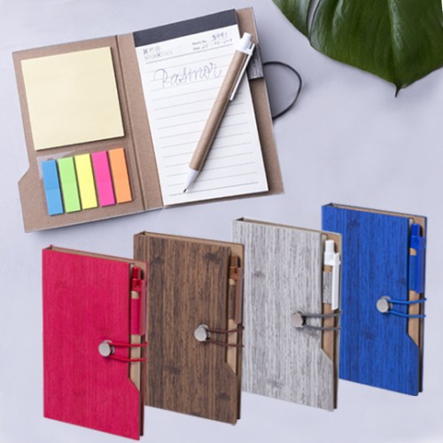 Bloc de notas en original polipiel veteada símil madera y en amplia gama de colores. Con bolígrafo de cartón reciclado incluido. De diseño ecológico, con tapas de suave tacto y cierre de elástico. Con soporte para el bolígrafo integrado, bloc de 70 hojas con distribución a una raya, 25 notas adhesivas medianas y 125 mini notas adhesivas. Bloc 70 Hojas. 25 Notas Adhesivas 7,5 x 7,5 cm. 125 Mininotas Adhesivas 1,2 x 4,5 cm. Bolígrafo Cartón Reciclado Incluido