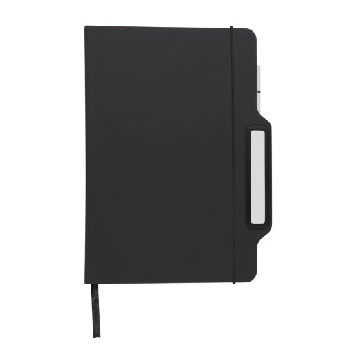 Bloc de notas soporte fabricado en suave PU. Con tapas rígidas,cuenta con soporte para smartphone en portada. Incluye bolígrafo de escritura eterna en color blanco. Con 80 hojas interiores lisas de color crema, elástico de cierre negro y marcapáginas a juego. Portada Rígida. 80 Hojas. Bolígrafo Lápiz Eterno Incluido
