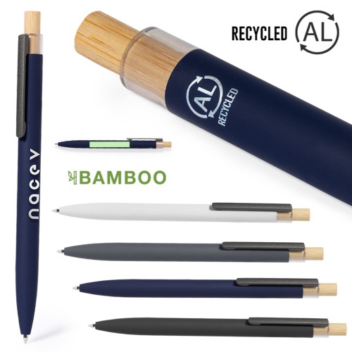 Bolígrafo de mecanismo pulsador fabricado en aluminio reciclado. Pulsador en bambú y cuerpo acabado goma, disponible en variada gama de elegantes colores. Clip metálico y distintivo aluminio reciclado en la parte superior del bolígrafo. De cartucho jumbo y en tinta azul. Presentado en bolsa individual reciclada.El aluminio reciclado es un material con posibilidades de reciclaje casi infinitas, sin perder sus propiedades originales y consumiendo menos energía en este proceso.Certificación GRS (Global Recycled Standard / Estándar de Reciclaje Global), que garantiza el origen reciclado del material usado para fabricar el producto. Carga Jumbo