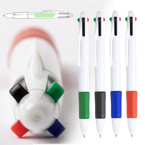Bolígrafo 4 en 1 de mecanismo pulsador retráctil, de clásico diseño y cuerpo de suave acabado sólido en color blanco. Suave empuñadura a juego en vivos colores. De 4 cartuchos, en tintas azul, negra, roja y verde. Escritura 4 Colores