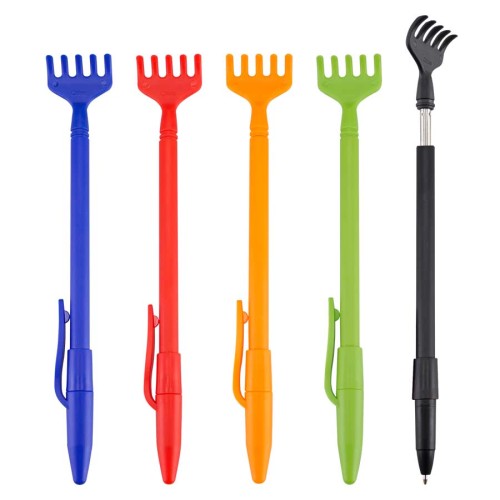 Bolígrafo plástico de color con tapa, con Manito Rascadora expansible (tipo antena). Escritura azul.