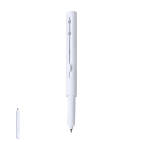 Bolígrafo cúter con cuerpo en ABS en acabado mate. Con pulsador que permite que por un extremo salga el cuerpo del bolígrafo en tinta azul y en el otro extremo punta de metal del cúter se puede retraer cuando no está en uso para mayor seguridad. Ideal para cortar con precisión.