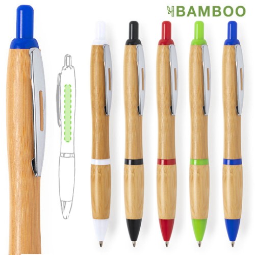Bolígrafo con mecanismo pulsador de línea nature, con cuerpo en bambú y detalles en variada gama de colores. Con original clip metálico troquelado y cómoda empuñadura de bambú. Tinta azul.