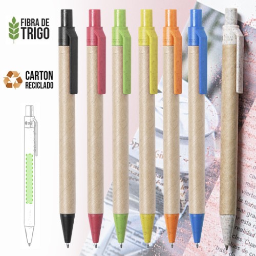 Bolígrafo de línea nature con mecanismo pulsador. Combinación de cuerpo en cartón reciclado de color natural y accesorios en caña de trigo y ABS , para así fomentar la utilización y reciclado de materias primas, reduciendo así las emisiones contaminantes. Disponible en variada gama de colores, con tinta azul. Distintivo Wheat Straw en la parte superior del bolígrafo.