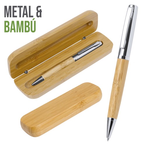 Elegante bolígrafo de bambú y metal con mecanismo giratorio. Cuerpo en resistente metal de acabado brillo y empuñadura en bambú . Clip metálico y en tinta azul. Presentado individualmente en un estuche de bambú. Materiales como el bambú fomentan la utilización de materias primas naturales, reduciendo las emisiones contaminantes. Proviene de una planta de gran resistencia y versatilidad, con crecimiento y regeneración rápidos, siendo una excelente alternativa al uso de madera tradicional.