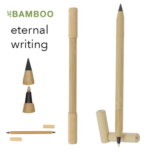 Bolígrafo lápiz eterno 2 en 1 fabricado en bambú. Dispone de un doble cierre de capucha en cartón reciclado. En un extremo, cuenta con un bolígrafo con tinta azul; en el otro, un lápiz eterno que permite escribir de forma continua sin necesidad de reemplazo.Materiales como el Bambú fomentan la utilización de materias primas naturales reduciendo las emisiones contaminantes. Además, el bambú proviene de una planta de gran resistencia y versatilidad, con crecimiento y regeneración rápida, siendo una excelente alternativa al uso de madera tradicional.