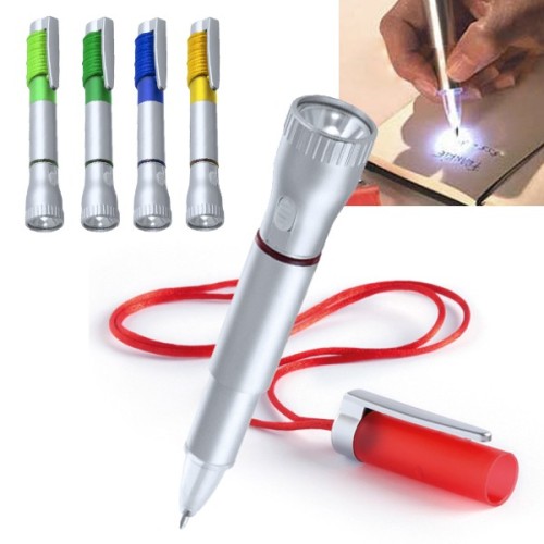 Boligrafo con linterna led integrada. De original diseño bicolor y cuerpo en suave acabado de color plateado. Capucha translúcida en vivos colores con cinta de transporte a juego. En tinta azul y con pilas de botón incluidas. 2 Ledes. Pilas Botón Incluidas
