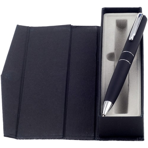 Metal. Cuerpo metálico engomado. Clip y detalles color plata. Tinta negra. Estuche con cierre magnético. Área de impresión: Ø 0,8 x 5 cm. Destape electroplateado en la parte superior. Presentación en estuche con cierre magnético.