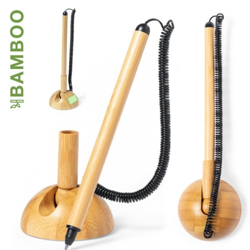 Bolígrafo de línea nature fabricado en bambú, en tinta azul y con cable extensible. Incluye soporte de bambú para el bolígrafo, con adhesivo 3M en la base, fijación extra fuerte y libre de residuos al despegarlo. Presentado en caja individual de diseño kraft. Base Adhesiva