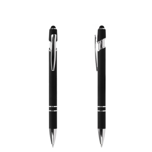 Bolígrafo metálico con cuerpo negro terminación "rubber" y terminal "touch-screen". Escritura azul.