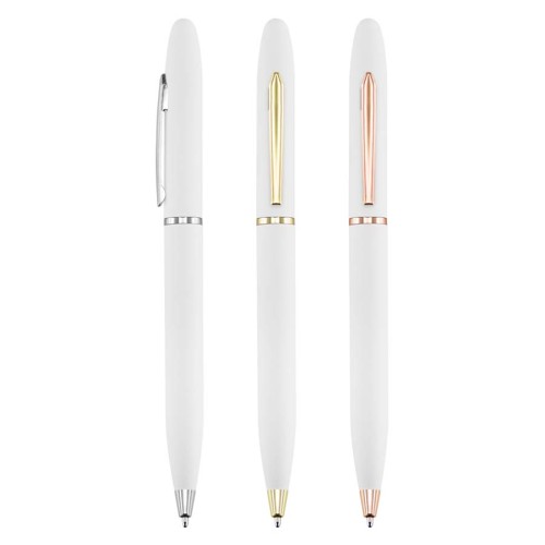 Fino bolígrafo Metálico blanco modelo "Trooper", con terminales metálicos. Diseño simple y moderno. Escritura negro.