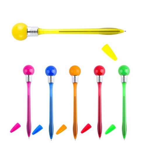 Divertido bolígrafo bombilla con cuerpo de suave acabado en vivos colores transparentes. Con linterna esférica de goma con luz a juego que se activa dejando caer el bolígrafo en una superficie dura. Capucha a juego y en tinta azul. Luces Led Multicolor. Pilas Botón Incluidas