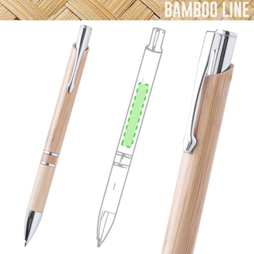 Bolígrafo de línea nature con cuerpo en madera de bambú. De mecanismo pulsador, con clip troquelado y detalles en acabado cromado. De cartucho jumbo y tinta negra. Carga Jumbo. Tinta Negra