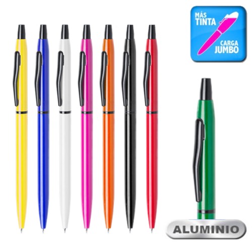 Bolígrafo de mecanismo pulsador en alegre diseño bicolor. Con cuerpo en aluminio de suave acabado en alegres colores. Accesorios y anillas en negro. Original clip en negro, de cartucho jumbo y tinta azul. Carga Jumbo