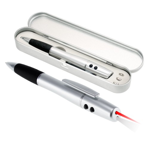 Bolígrafo plástico multi-función 3 en 1. Incluye bolígrafo, linterna LED y puntero láser. Escritura negra. Presentación en estuche metálico y caja plateada de cartón.