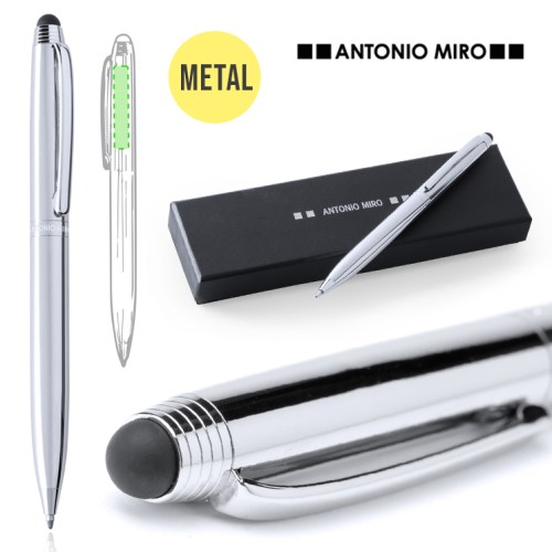 Bolígrafo puntero de Antonio Miró de mecanismo giratorio con suave cuerpo metálico, de elegante color plateado. Clip de diseño a juego. Presentado en estuche individual negro con logotipo de la marca. Tinta azul. Carga Jumbo