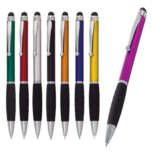 Bolígrafo puntero de mecanismo giratorio de elegante diseño bicolor con accesorios en color plateado brillante y cuerpo de suave acabado en llamativos colores metalizados brillantes. Con clip metálico y anilla a juego. Suave empuñadura de original diseño y tinta azul.