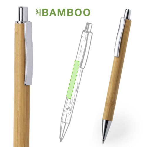 Bolígrafo de línea nature con cuerpo en bambú y accesorios cromados. De mecanismo pulsador y en tinta azul.