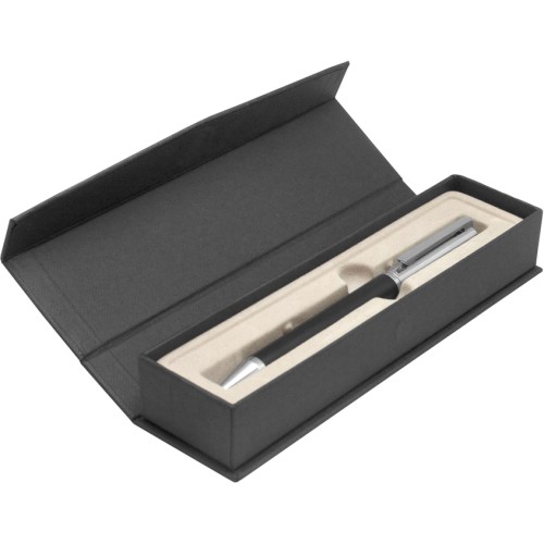 Metálico. Bolígrafo con apertura giratoria. Destape acero en la parte superior e inferior. Cuerpo color negro. Clip, tambor superior y puntera color plata. Tinta azul. Presentación en estuche con cierre magnético.