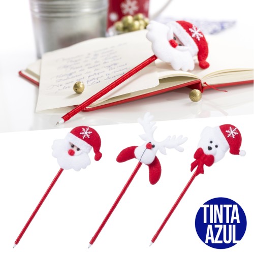Bolígrafo en original diseño navideño con cuerpo en acabado metalizado brillante. Disponible en diseños Papá Noel, reno y osito de peluche. Con tinta azul.