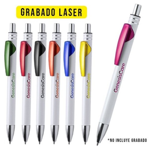 Bolígrafo de mecanismo pulsador con cuerpo de aluminio, acabado sólido en color blanco y clip en variada gama de colores metalizados de acabado brillante. Clip con amplia superficie de impresión. Especialmente diseñado para marcaje en láser y con un recubrimiento exterior especial para que tu publicidad quede perfectamente grabada, a juego con el color del clip. Tinta azul.