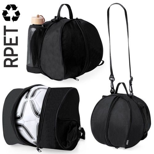 Práctica bolsa para balones fabricada en RPET. Cuenta con un compartimento central que permite guardar una pelota mediante un cierre de cremallera, siendo fácil de transportar tanto por el asa de mano como por la cinta para hombro. Además, dispone de dos bolsillos laterales de rejilla. Con logotipo RPET en etiqueta. El material RPET se elabora a partir de plástico reciclado, para así fomentar la reutilización de residuos plásticos y ayudar a la sostenibilidad del planeta.