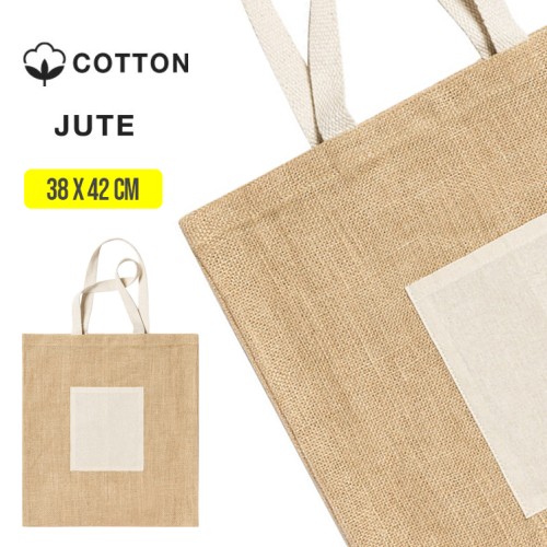 Bolsa en resistente combinación de cuerpo en yute de 240g/m2 y asas de algodón, todo en tono natural. De acabado cosido, con asas medianas reforzadas. Bolsillo frontal de algodón y resistencia hasta 6kg de peso.
