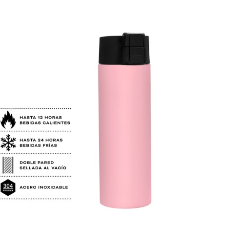 Ø 7 cm x 23 cm. Acero inoxidable. Capacidad 450 ml. Botella doble pared, sellada al vacío. Interior de acero 304 y exterior de acero 201. Pintura acabado mate. Tapa en PP con traba de seguridad y botón pulsador de apertura. Mantiene por más de 12 hs la temperatura de las bebidas calientes y 24 hs de las bebidas frías. Presentación en caja de regalo kraft.