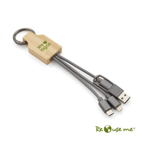 Cable 3 en 1 color gris, con una longitud de 12 cm. Es el accesorio perfecto para mantener tus dispositivos siempre cargados y listos para usar. Incluye cable de entrada TIPO C con adaptador USB A y 2 cables de salida MICRO B / LIGHTING, lo que te permite cargar dispositivos con diferentes tipos de entradas. Cuenta con un accesorio rectangular de bamboo de donde salen los cables y un gancho de aluminio en tono con los cables. ReUseMe.