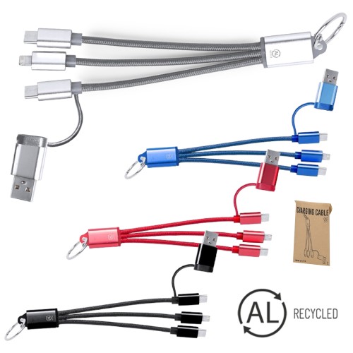 Cable cargador en Aluminio Reciclado. Con conexión de entrada dual Tipo C/USB y salidas Tipo C, Lightning y Micro USB. Incluye distintivo Aluminio Reciclado.El Aluminio Reciclado es un material con posibilidades de reciclaje casi infinitas, sin perder sus propiedades originales y consumiendo menos energía en este proceso.Certificación GRS (Global Recycled Standard / Estándar de Reciclaje Global), que garantiza el origen reciclado del material usado para fabricar el producto.Conexión Micro USB, Tipo C y Lightning 5V DC 2.4A Conexión Micro USB, Tipo C y Lightning 5V DC 2.4A