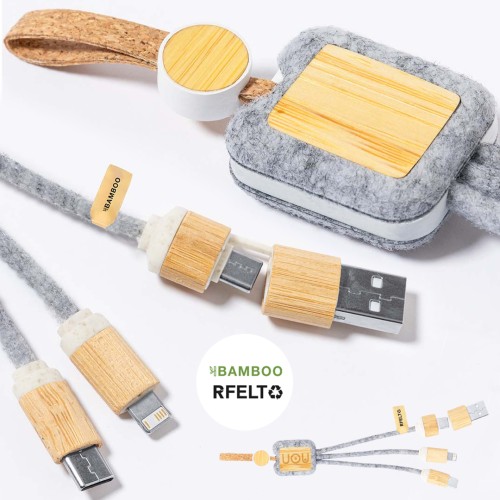 Cable cargador fabricado en bambú y fieltro RPET. Con conexiones de entrada Tipo C y USB y salidas Tipo C, lightning y Micro USB. 5V DC 2.4A. Presentado en bolsa individual de diseño kraft con autocierre, con distintivo en etiqueta.El fieltro RPET reciclado es fruto de la combinación del proceso de reciclaje de materiales plásticos junto a la técnica milenaria de fabricación del fieltro, dando como resultado un material de eco-tendencia que, además de ser de origen reciclado, también se convierte en reciclable. Conexión Micro USB, Tipo C y Lightning 5V DC 2.4A
