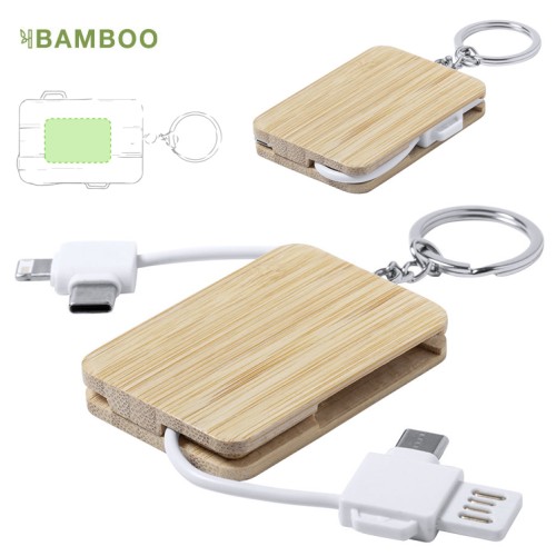 Cargador llavero de línea nature y diseño compacto. Hecho en bambú procedente de cortes naturales. Conexiones Tipo C (entrada y salida) y dual micro USB-Lightning, con sistema USB reversible que facilita la conexión a la fuente de alimentación. Amplia superficie de marcaje. Presentado en bolsa individual autocierre de diseño eco. Conexión Micro USB, Tipo C y Lightning 5V DC 2.0A