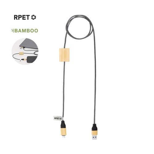 Cable cargador de 60 W en una combinación de RPET y bambú. Con conexiones de entrada Tipo C y USB y conexiones de salida Lightning, Micro USB y Tipo C. Potencia de carga: Hasta 60W, asegurando una carga rápida y eficiente. Apto para transferir datos. Conexión Micro USB, Tipo C y Lightning PD 60W