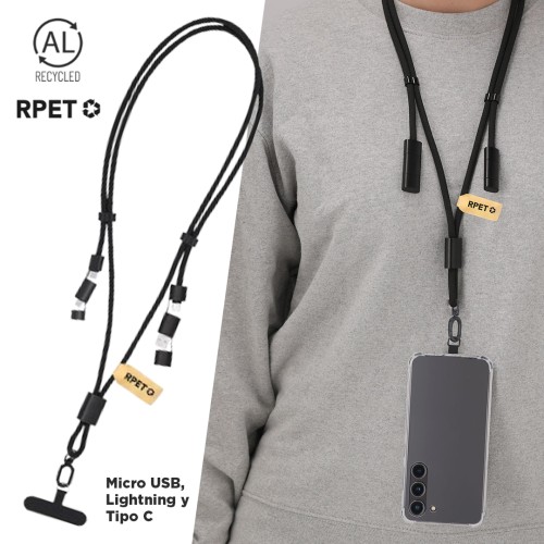 Innovador lanyard con función de soporte y cable cargador, fabricado en una combinación de poliéster RPET y aluminio reciclado. Diseñado para colocarse fácilmente entre la funda y el smartphone gracias a su accesorio de transporte. Incluye cinta a juego, mosquetón metálico giratorio en color negro y accesorio de seguridad para el cuello. Ofrece funcionalidad de carga y traspaso de datos, con entrada USB y Tipo C, y salidas Micro USB, Lightning y Tipo C. Presenta un distintivo de RPET en etiqueta kraft, destacando su compromiso sostenible.El material RPET se elabora a partir de plástico reciclado, para así fomentar la reutilización de residuos plásticos y ayudar a la sostenibilidad del planeta.El Aluminio Reciclado es un material con posibilidades de reciclaje casi infinitas, sin perder sus propiedades originales y consumiendo menos energía en este proceso.Certificación GRS (Global Recycled Standard / Estándar de Reciclaje Global), que garantiza el origen reciclado del material usado para fabricar el producto. Conexión Micro USB, Tipo C y Lightning 5V DC 2.4A
