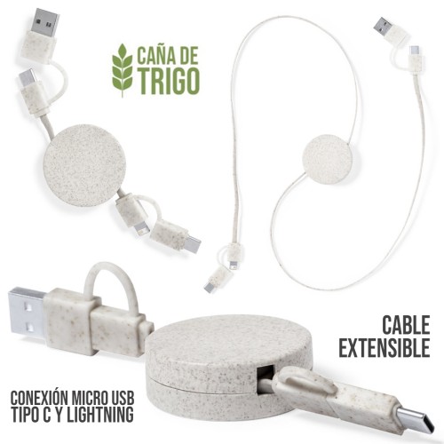 Cable cargador y sincronizador extensible, válido para cargar dispositivos y transferir datos. Fabricado en caña de trigo, para así fomentar la utilización de materias primas naturales y reducir las emisiones contaminantes. Pieza central con mecanismo interior extensible. Incluidas conexiones de entrada Tipo C y USB salidas Lightning, Micro USB y Tipo C. 5V DC 2.4A. Presentado en bolsa individual de diseño kraft. Apto para transferir datos. Cable Extensible. Conexión Micro USB, Tipo C y Lightning 9V DC 2.1A