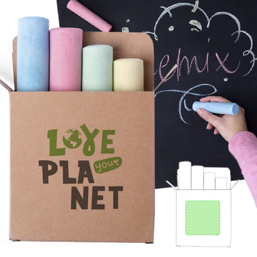 Caja de tizas tamaño XL. Estuche en cartón reciclado, con 4 tizas en colores azul, rojizo, verde y amarillo. 4 Tizas