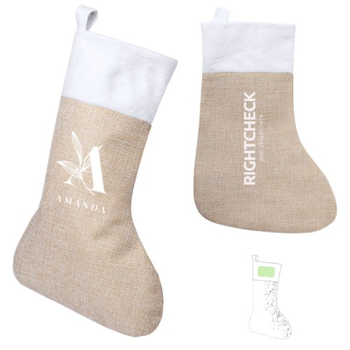 Calcetín navideño en combinación de colores natural y blanco. Incluye cinta para colgar, con amplia superficie de marcaje.