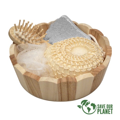 Canasto SPA de belleza en madera modelo "Naturals". Contiene cepillo de pelo, esponja malla, piedra pomez y esponja de masaje corporal.