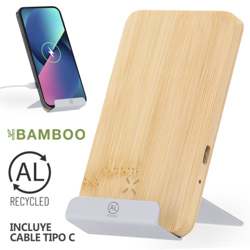 Cargador inalámbrico 15W con función soporte para smartphone fabricado en bambú y Aluminio Reciclado. Indicador LED de estado de carga y compatible con dispositivos equipados con tecnología de carga inalámbrica, incluye cable tipo C. Con distintivo aluminio reciclado.Materiales como el bambú fomentan la utilización de materias primas naturales reduciendo las emisiones contaminantes. Además, el bambú proviene de una planta de gran resistencia y versatilidad, con crecimiento y regeneración rápida, siendo una excelente alternativa al uso de madera tradicional.El aluminio reciclado es un material con posibilidades de reciclaje casi infinitas, sin perder sus propiedades originales y consumiendo menos energía en este proceso. Certificación GRS (Global Recycled Standard / Estándar de Reciclaje Global,NULL), que garantiza el origen reciclado del material usado para fabricar el producto.Fabricado conforme a los estándares RoHS y en cumplimiento con los siguientes requisitos de seguridad:Sistema de protección contra sobrecalentamiento. Sistema de protección contra sobrecarga. Sistema de bloqueo para evitar cortocircuitos. Inalámbrico 15W