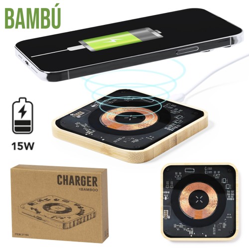 Cargador inalámbrico 15W, con un original diseño y ventana transparente que permite ver los componentes internos del dispositivo. Con base bambú cuadrada y compatible con dispositivos con tecnología Qi. Conexión Tipo C, con manual de instrucciones en español e inglés. Presentado en caja individual de diseño kraft. Materiales como el bambú fomentan la utilización de materias primas naturales, reduciendo las emisiones contaminantes. Proviene de una planta de gran resistencia y versatilidad, con crecimiento y regeneración rápidos, siendo una excelente alternativa al uso de madera tradicional. Fabricado conforme a los estándares RoHS y en cumplimiento con los siguientes requisitos de seguridad: Sistema de protección contra sobrecalentamiento. Sistema de protección contra sobrecarga. Sistema de bloqueo para evitar cortocircuitos. Inalámbrico 15W