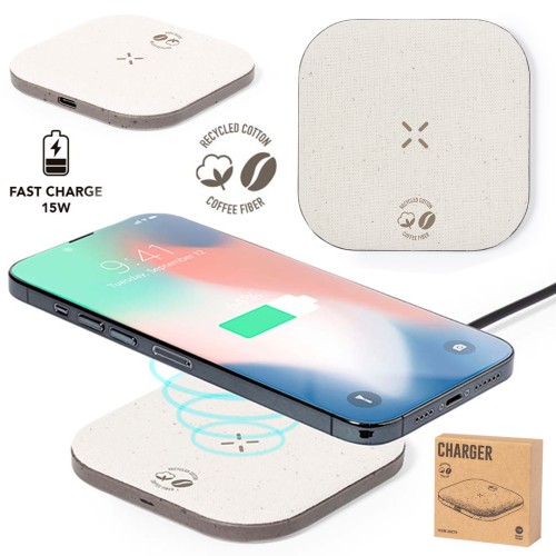 Cargador inalámbrico fabricado en fibra de café y algodón reciclado. Base antideslizante y compatible con dispositivos equipados con tecnología de carga Qi. Capacidad de carga de 15W, con cable negro Tipo C incluido. Con distintivos de fibra de café y algodón reciclado. Presentado en atractiva caja de diseño kraft, con manual de instrucciones en español e inglés.La fibra de café es una solución circular que se obtiene de la utilización de los residuos producidos en la obtención del café. Una alternativa sostenible que favorece la reducción del uso de plásticos, ahorrando energía en su proceso de fabricación y contribuyendo al cuidado del medio ambiente.Disponible certificación GRS (Global Recycled Standard / Estándar de Reciclaje Global), que garantiza el origen reciclado del material usado para fabricar el producto. Inalámbrico 15W