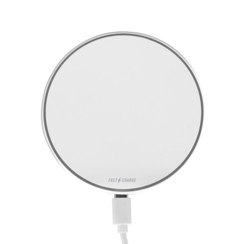 Ø 9,7 x 0,9 cm. Plástico ABS. Cargador inalámbrico con luz. Base plástica color blanco con antideslizantes. CARGA RÁPIDA. Salida: 15 watts. Luces indicadoras de carga. Cable de carga USB-C en color blanco de 50 cm de largo. Compatible exclusivamente con celulares que permitan carga inalámbrica (tecnología qi). Presentación en caja de regalo kraft.