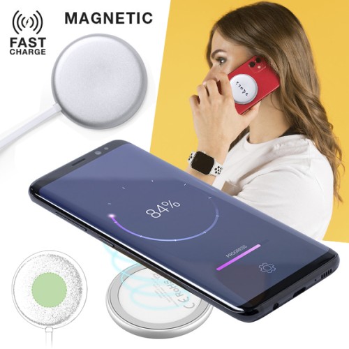 Cargador inalámbrico magnético 10W. Carcasa fabricada en resistente aluminio de acabado plateado. Con indicador de estado de carga y cable USB de 1m con conector de aluminio. Incluye accesorio metálico con adhesivo 3M, de fijación extra fuerte y libre de residuo al despegarlo del dispositivo, permitiendo así el uso de la función magnética del cargador en cualquier dispositivo móvil. Compatible con terminales equipados con tecnología de carga inalámbrica. Amplia superficie de marcaje y presentado en atractiva caja de diseño. Disponible manual de instrucciones en español e inglés. Inalámbrico 10W. Magnético