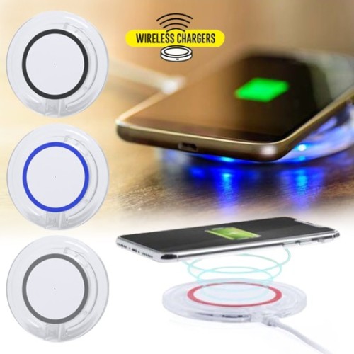 Cargador inalámbrico circular. Cuerpo transparente con detalle en variada gama de vivos colores. Con base antideslizante e indicador led de estado de carga. Compatible con dispositivos equipados con tecnología de carga inalámbrica y presentado en atractiva caja de diseño. Inalámbrico 5W