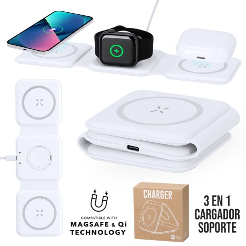 Completo cargador inalámbrico magnético 15W, diseñado para la carga simultánea del smartphone, auriculares y smartwatch. Un gadget todo en uno: plegable, portátil, de tamaño compacto, muy versátil y de diseño funcional. Conexión por usb Tipo C -cable incluido- y elaborado en resistente ABS de color blanco. Fabricado conforme a los estándares RoHS y en cumplimiento con los siguientes requisitos de seguridad:Sistema de protección contra sobrecalentamiento.Sistema de protección contra sobrecarga.Sistema de bloqueo para evitar cortocircuitos. Inalámbrico 15W. Magnético